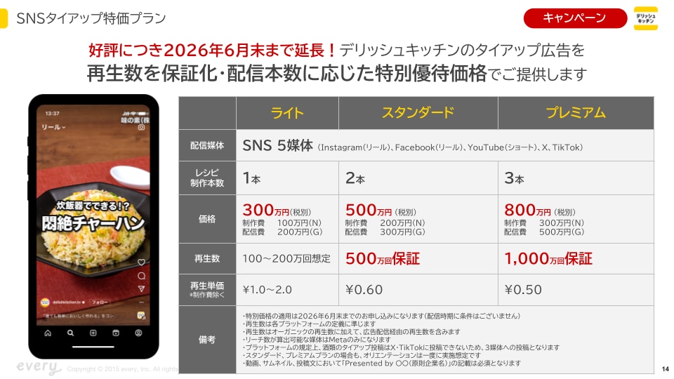 デリッシュキッチンでは現在、SNSタイアップの特価プランを提供中です。レシピ動画制作からSNS配信、広告ブーストまでをワンストップで実施し、店頭売上への貢献を目指します。