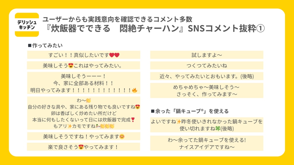 コメント欄には、「作ってみたい」「余った『鍋キューブ®』を使えそう」といった生活者からの強い関心、実際に本レシピを作った方からのレビューが集まり、施策の目的であった実践意向獲得まで行えたことが示唆されました。
