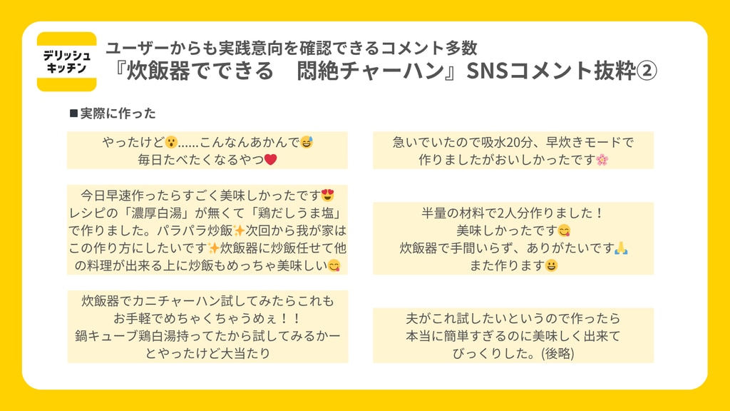 特に好調であった『炊飯器でできる 悶絶チャーハン』がバズった要因はSNSのトレンドをおさえながら、レシピ自体の持つ「意外性」と「実用性」が巧みに組み合わさったためと考えられます。