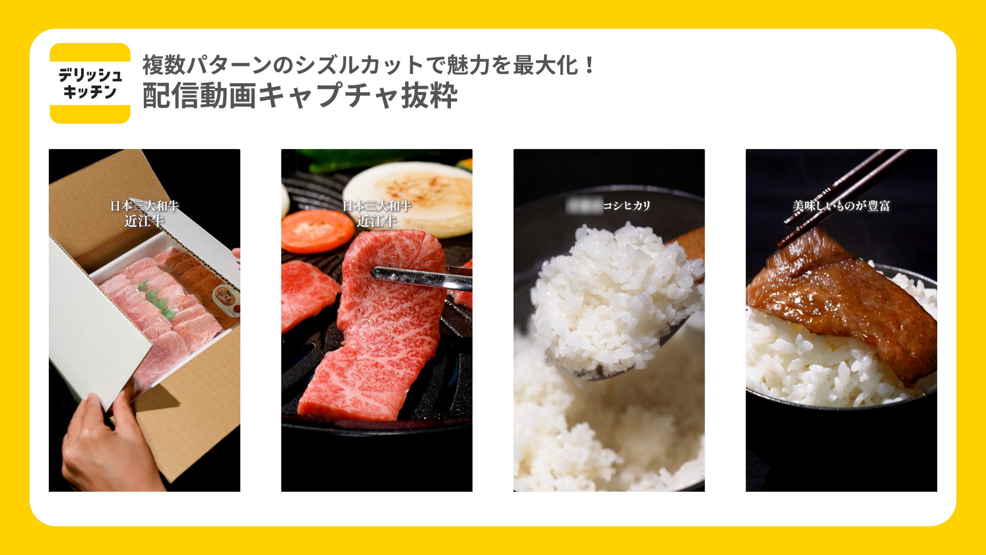 - 視覚と聴覚を刺激する「シズル演出」5万本以上のレシピ動画を制作してきた知見を活かし、鉄板の上で肉汁が溢れ出す近江牛の焼ける音、湯気が立ちのぼる炊き立ての白米など、視聴者の視覚と聴覚をダイレクトに刺激するカットをショート動画にまとめました。
