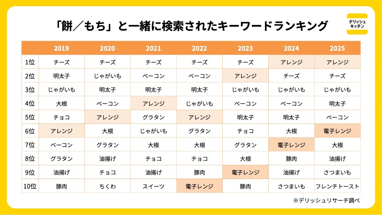毎年お正月に急増する「餅」の検索動向を分析し、今年流行しそうなアレンジレシピを考案しました。