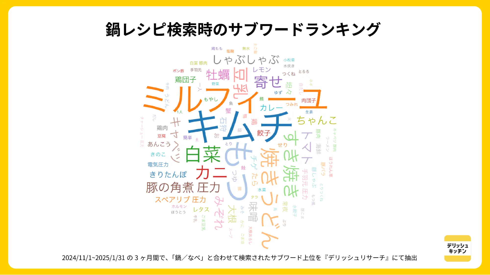 昨年冬に、『デリッシュキッチン』で「鍋」と一緒に検索されたキーワードでは、見た目が美しい「ミルフィーユ鍋」が上位にランクインしました。