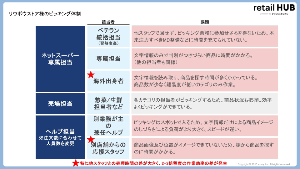 日本語に不慣れな海外出身のスタッフや別店舗からの応援スタッフ(ヘルプ)は作業スピードが速い熟練スタッフと比べ2-3倍以上の差があり、作業水準の標準化に課題が起きていました。