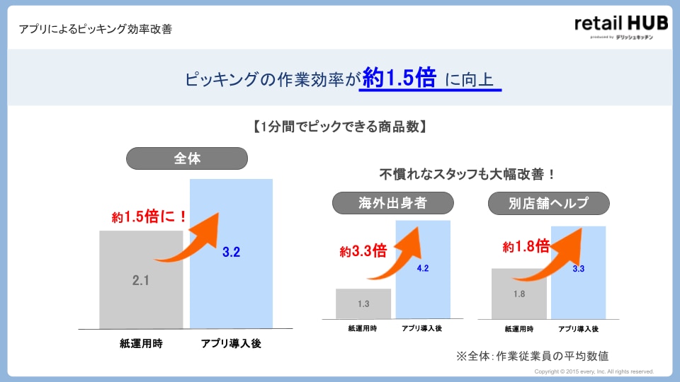 アプリの導入により、全スタッフの作業効率(1分間に処理できる商品点数)は平均約1.5倍に向上しました。作業時間が特にかかりやすいスタッフにおいては、より大きな改善効果が出ています。