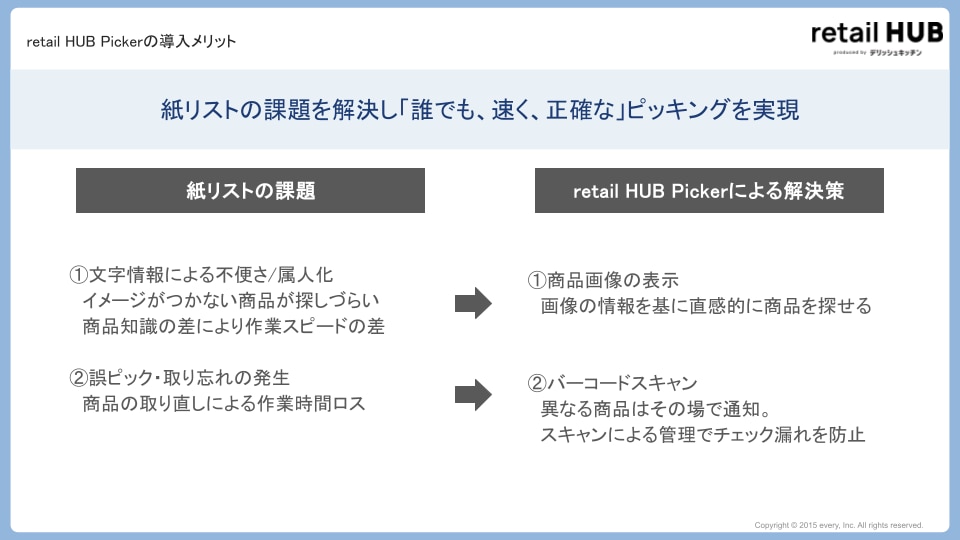 上記のような紙運用による課題を解決するため、ピッキングアプリ『retail HUB Picker』を導入し、アプリによる運用体制に切り替えました。