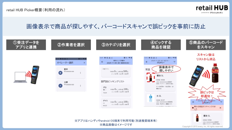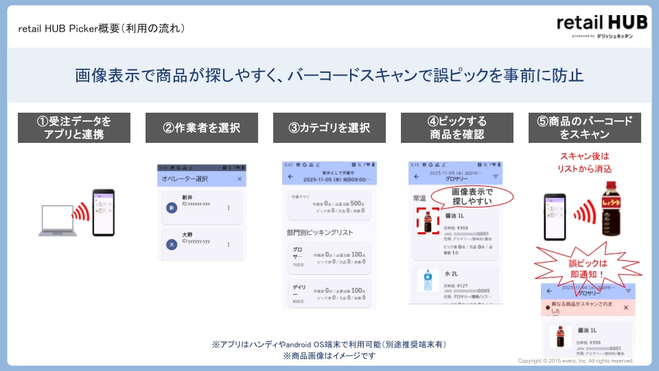retail HUB Pickerはアプリ上に表示される商品リストをもとに、店頭の商品バーコードをスキャンすることで記録していくアプリです。ハンディターミナルやandroid OSの端末(*2)にて利用できます。