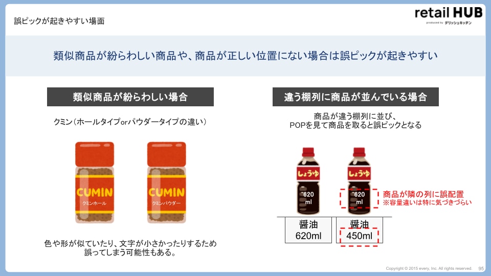 導入前は、ピックした商品全体のうち約2%の誤ピックが発生していましたが、アプリ導入後は誤ピックの発生件数が0となりました。下記のような誤ピックが起きやすい場面でも、商品ピック時に正誤判定が行われるため、事前に誤ピックを防止できています。